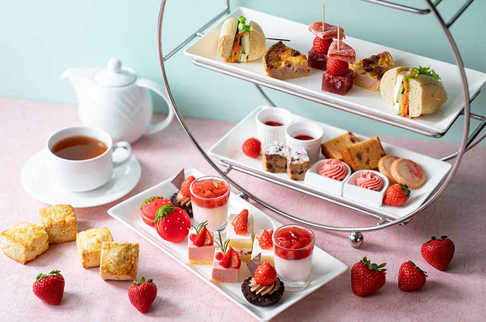 苺×ホテルで採れたスイートバジルのコンフィチュールなど、冬から春にかけて旬を迎える“苺”がティースタンドを華やかに彩る「ストロベリーアフタヌーンティー」をご用意します。ドリンクは90分制、ご利用は2時間。