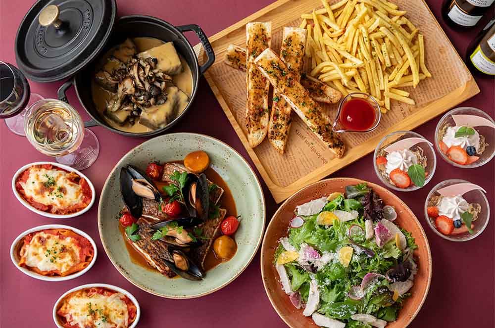 サザンタワーダイニングの大皿料理をシェアするディナー「グループプラン」。ビールやワイン、サングリア、ソフトドリンクなど約40種類のドリンクメニューが90分フリーフロー。