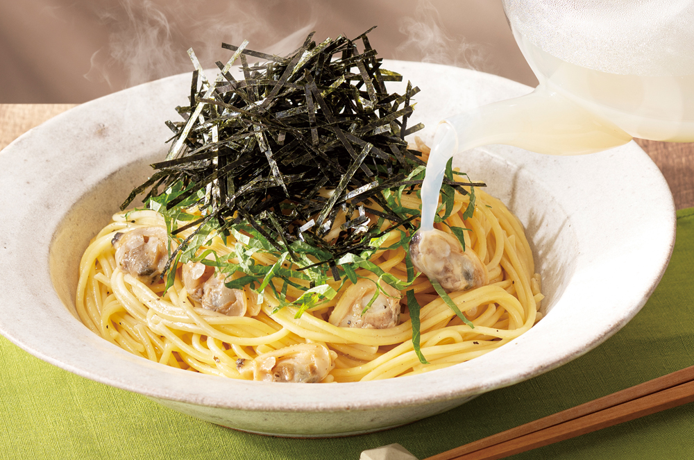 さらに、別添えの旨味たっぷりのあさり出汁を注ぐことで、深みのあるスープパスタとして二度お楽しみいただけます。