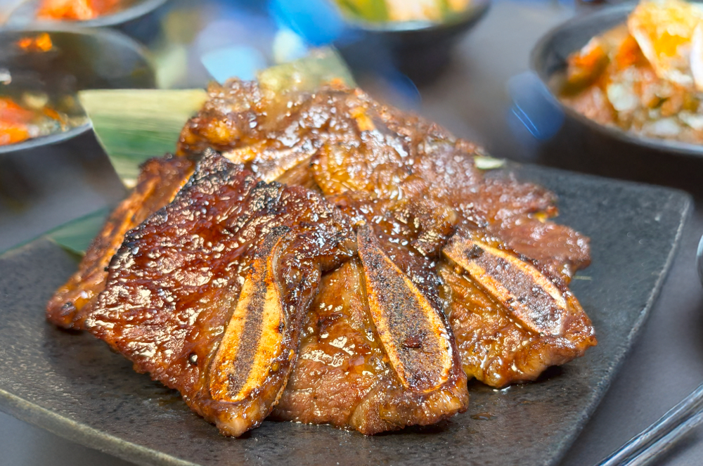 骨付きの薄切り牛カルビを、甘辛い醤油ベースのタレに漬け込んだ、韓国焼肉の一つ!